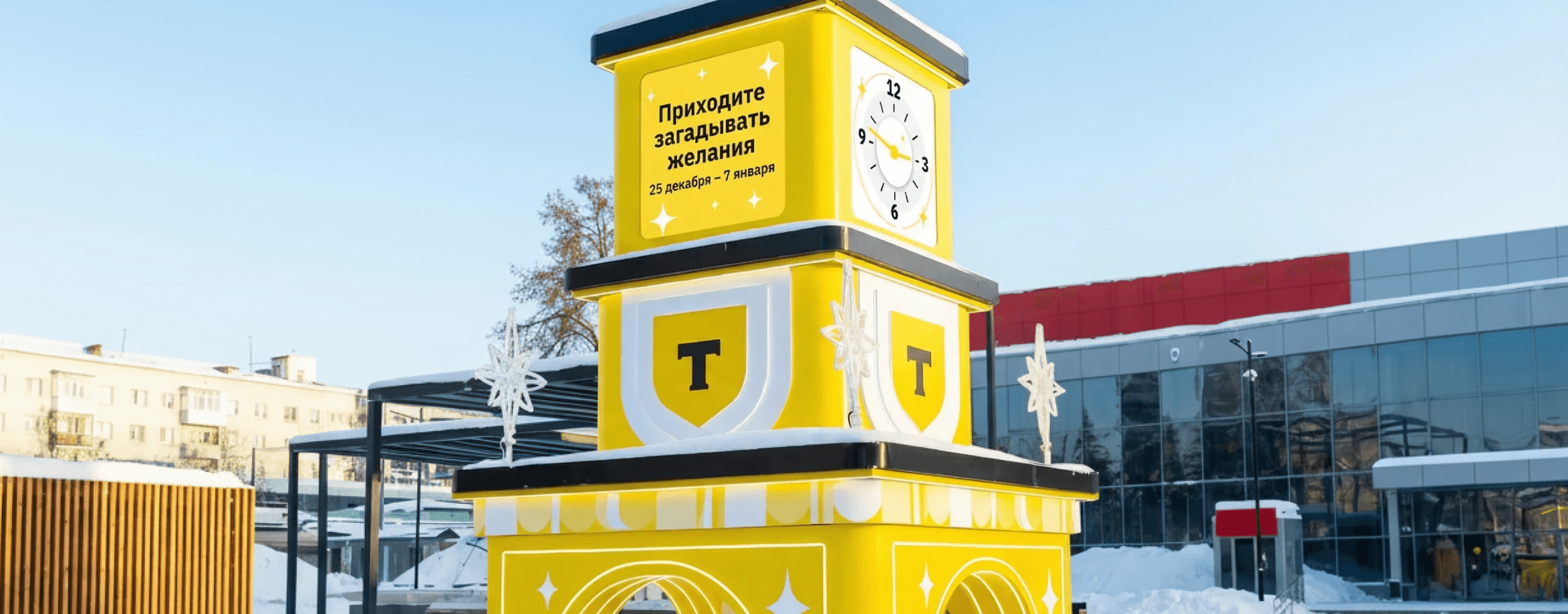 - Два других — стилизованные часы, которые каждый час запускали анимацию: бой курантов, летящие шары, снежинки и призыв «Время загадать желание».
